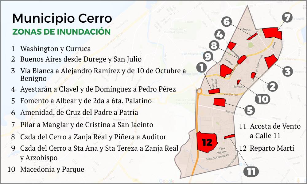 En el caso del Consejo Popular Cerro sucede algo similar, a pesar de que son zonas bajas que sufren inundaciones frecuentes con lluvias de mediana magnitud. Específicamente, en las calles Domínguez, San Pablo y Auditor la situación llega a ser crítica, pues además de la falta de mantenimiento se suma que estas vías son atravesadas por la Zanja Real (también carente de la limpieza requerida).