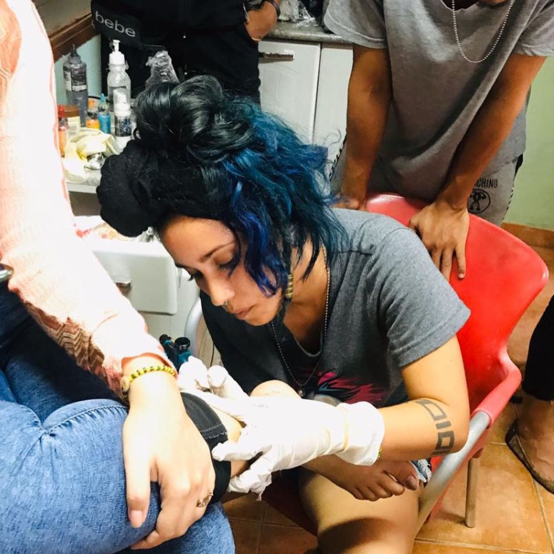 Giselle se hizo su primer tatuaje mientras estudiaba en la universidad. “Me empecé a interesar, me hice más tatuajes, y así fui aprendiendo, observando. Luego me regalaron la primera máquina”. Lo que más le gusta hacer es el estilo blackwork. Saca su celular y me muestra ejemplos. “Prefiero los tribales, como los que hacían los aborígenes en Cuba. Son únicos, diferentes, rápidos. Y sé que me van a salir bien porque necesitan una técnica y precisión específicas que he ido adquiriendo”.