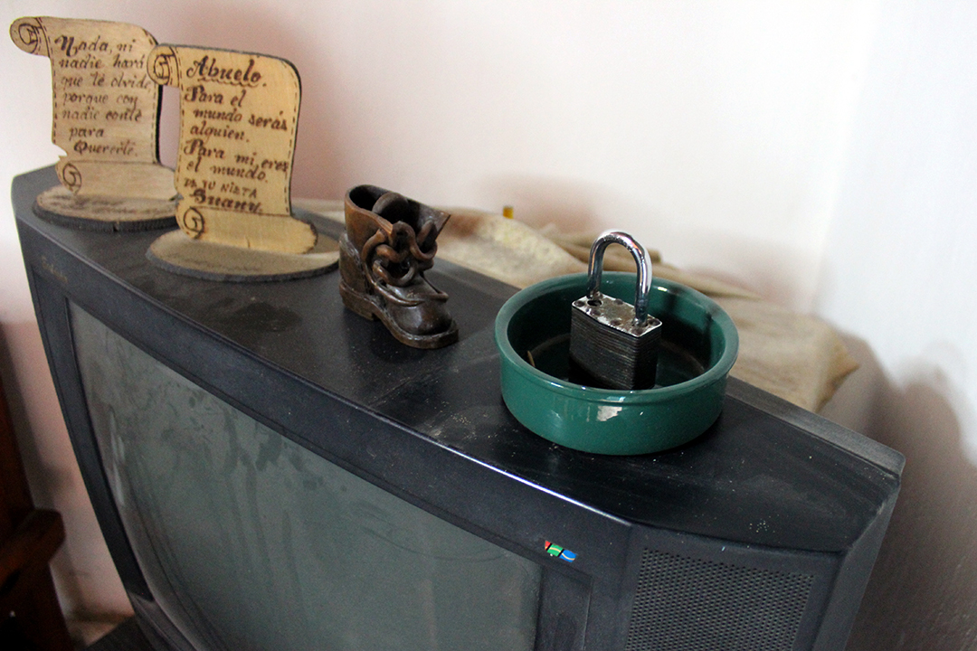 Alejandro: “Mira para arriba del televisor. Es mi salbutamol para el asma, que casi nunca se me quita por el humo de la chimenea. Aquí el polvo es constante y no solo te ensucia la ropa, sino toda la casa. Por ejemplo, yo que vendo cosas variadas las exhibo en mi ventana y por la tarde cuando recojo lo que me quedó del día, tienen una capa negra encima que me afea los productos y así nadie los quiere comprar”.