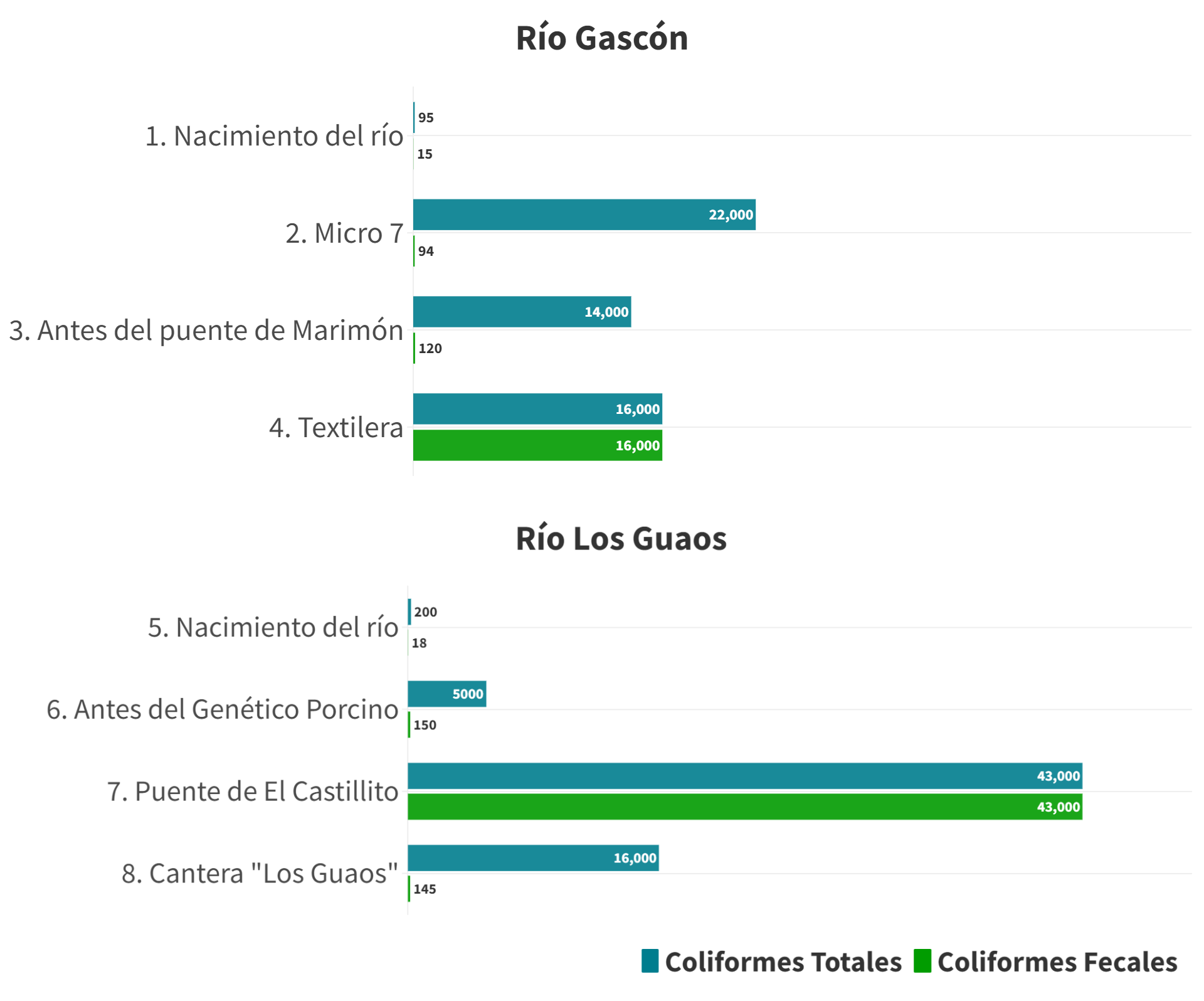 Considerando los resultados de los parámetros microbiológicos, se puede plantear que en toda la cuenca es severa la contaminación por aguas albañales, excepto en los sitios cercanos a los nacimientos de ambos ríos. Los valores de Escherichia coli, sin embargo, indican que esta bacteria no representa un peligro, pues se encuentra por debajo de la dosis infectiva, que es de 10⁶ microorganismos.