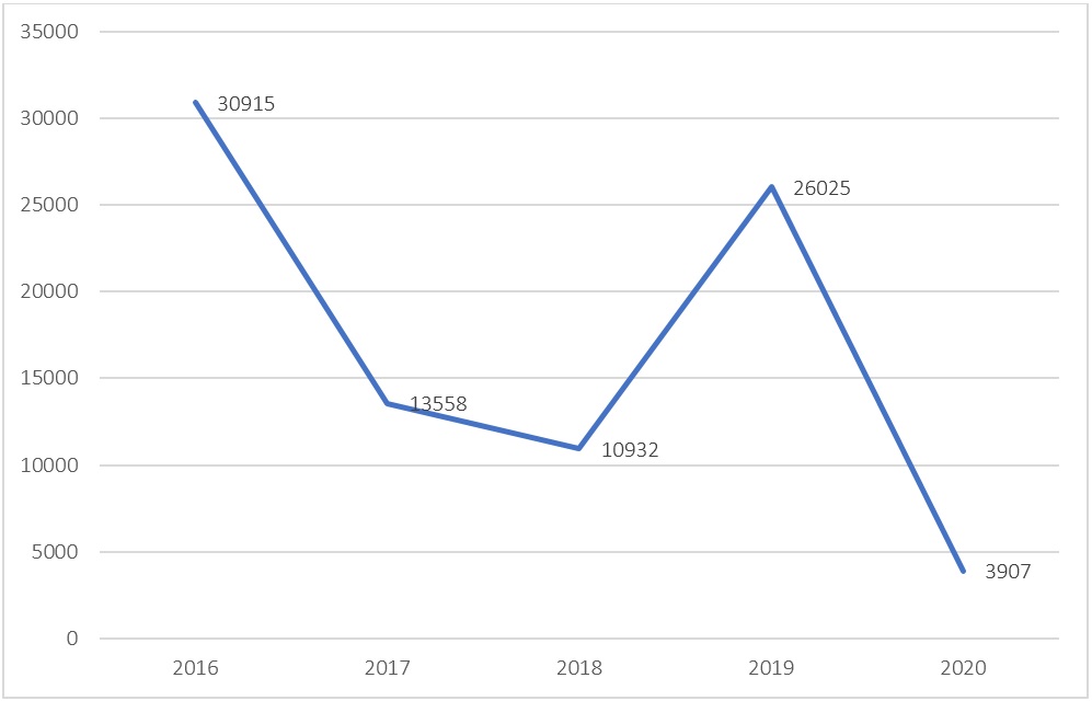 Cuba contaba con 68 879 habitaciones en 2020, las cuales representaban el 90.9 % del total de servicios de alojamiento del país. Al mismo tiempo, la tasa de ocupación media anual de los hoteles y otros establecimientos estatales era de 24 % debido a los efectos de la pandemia. Sin embargo, antes de la COVID-19 ya se había producido un descenso de 61.5 % (2016) a 49.8 % (2019). Ello implica que, como promedio, más de la mitad de las habitaciones existentes permanecieron vacías en ese último año.
