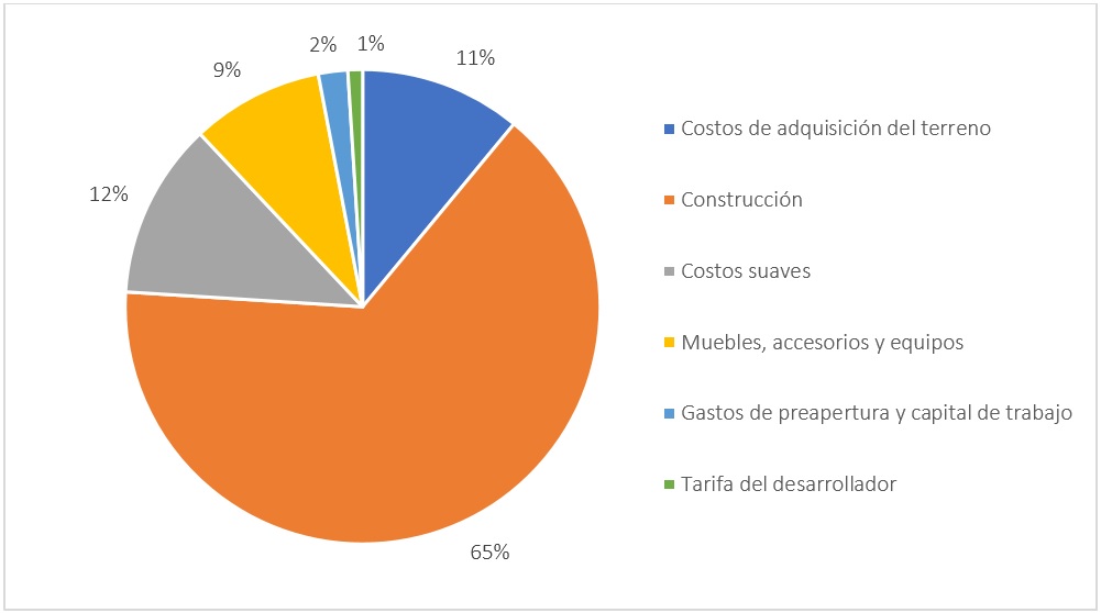 De ellos, la mayor inversión se realiza en la construcción, con un 65 % del total, seguida por los costos suaves (12 %) y la adquisición del terreno (11 %).